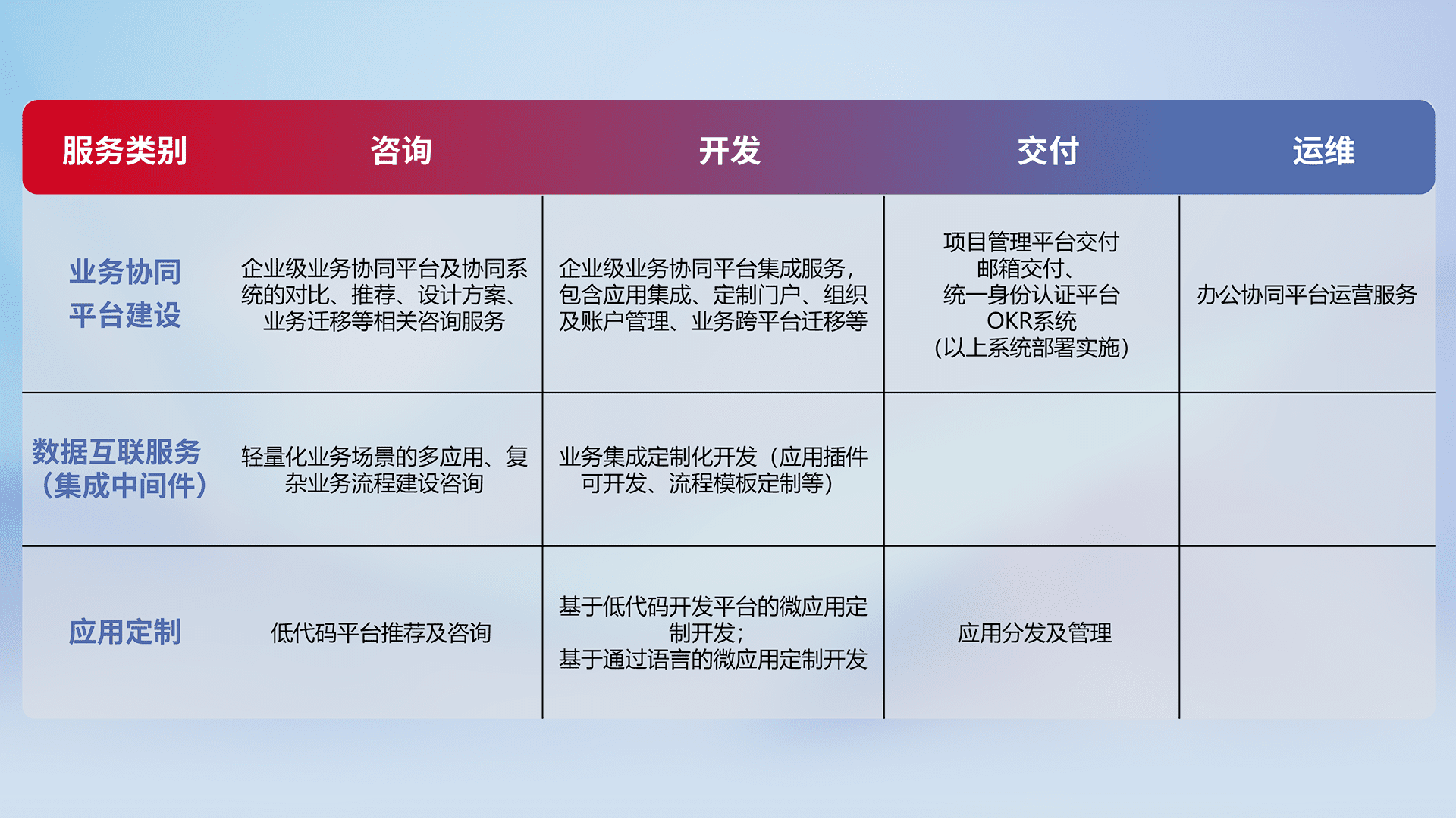 针对钉钉、、、、企微、、、、IDaas等平台级产品提供产品的规划、、、、方案、、交付、、、定制化开发等服务,,实现如统一协同办公、、智能客户服务、、混合会议管理、、智能数据查询、、、等业务场景,,实现数字化转型。。。。