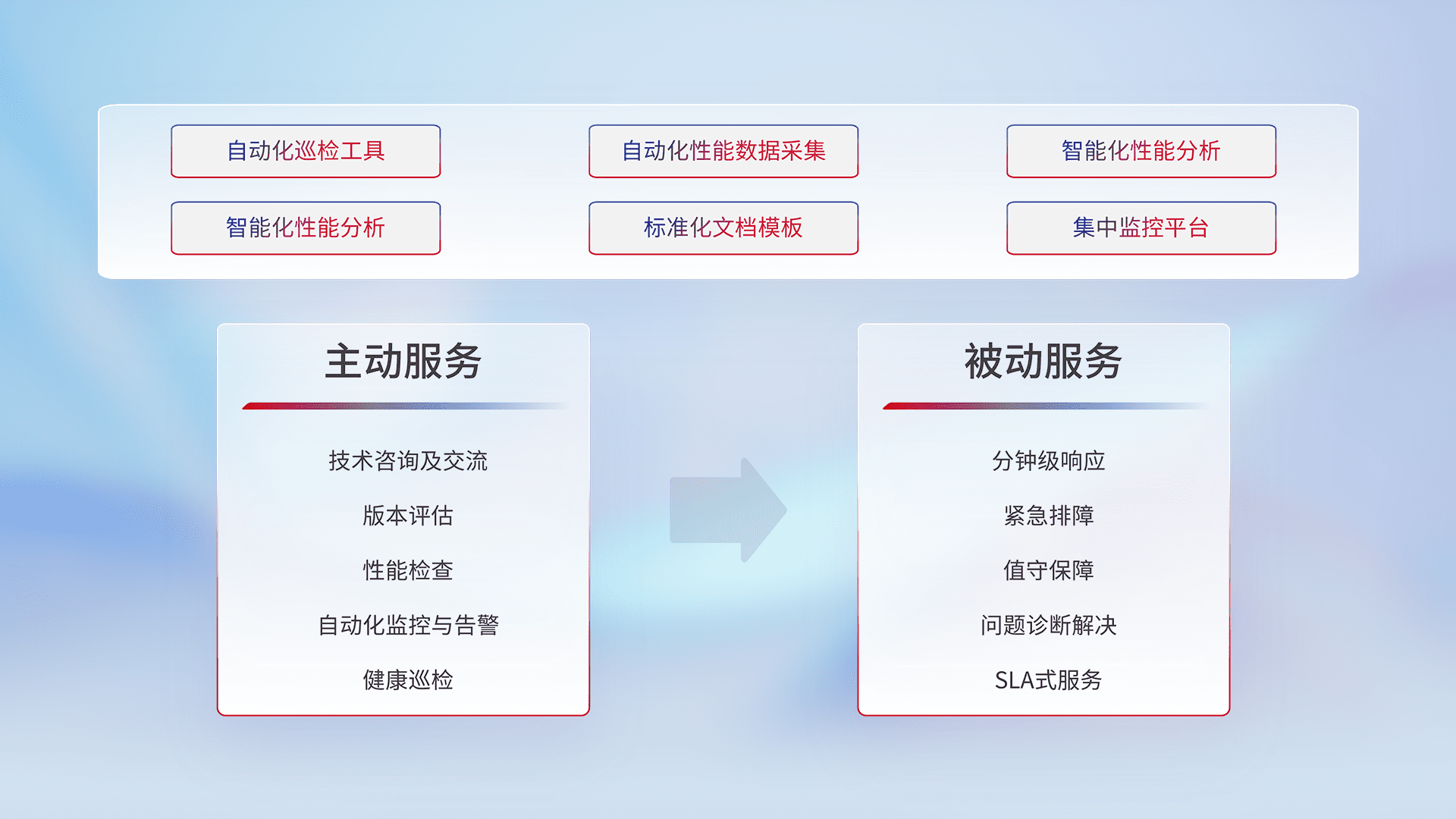 智能化工具和标准化文档,,保障服务质量,,,提供主动服务(包含技术咨询、、版本评估、、、、性能检查、、自动化监控与告警、、健康巡检)和被动服务包含(分钟级响应、、、紧急排障、、值守保障、、、问题诊断解决、、SLA服务)。。。。